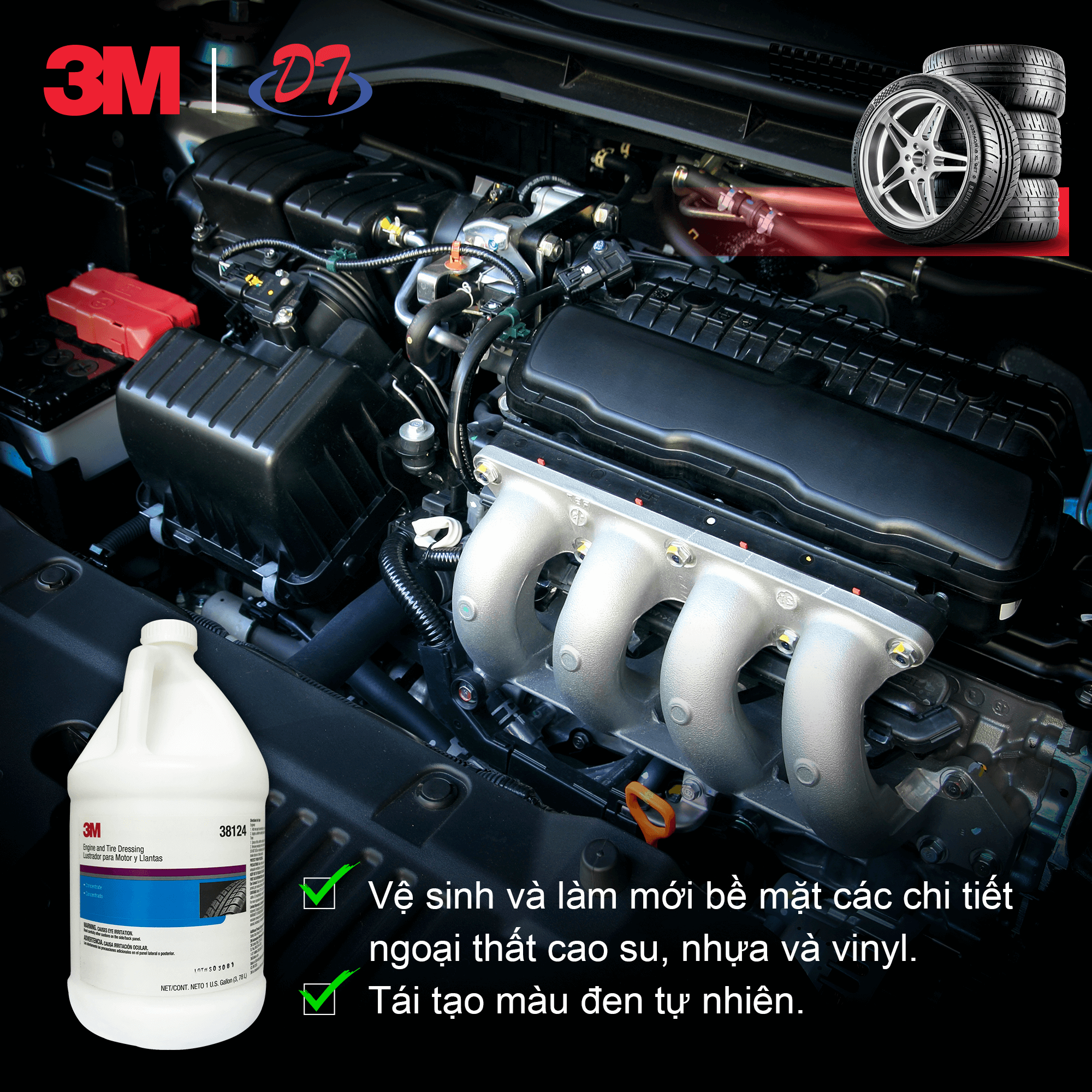 - Tái tạo màu đen tự nhiên cho lốp xe ô tô và khoang động cơ.